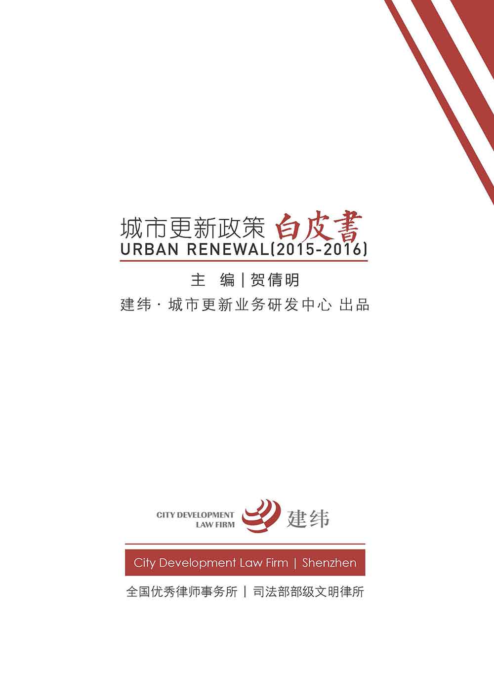 编者:建纬(深圳)律师事务所 出版时间:0001-01-01城市更新制度的“蝶变”必将带来市场的重新洗牌。值2016年年末,建纬城市更新业务中心特收集、整理、研究2015-2016年间的城市更新政策法规、城市更新发展现状形成本《城市更新政策白皮书(2015-2016)》,以期助力及时、全面掌握城市更新最新法律动态和发展趋势,迎接城市更新带来的机遇和挑战。